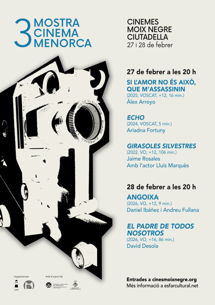 El millor cinema de ficció vinculat a Menorca torna a la gran pantalla! La III Mostra de Cinema de Menorca reuneix durant dos dies curtmetratges i llargmetratges rodats a l’illa o amb el talent de creadors i intèrprets menorquins. Una cita imprescindible per descobrir noves mirades i celebrar el cinema fet des de i per Menorca.
